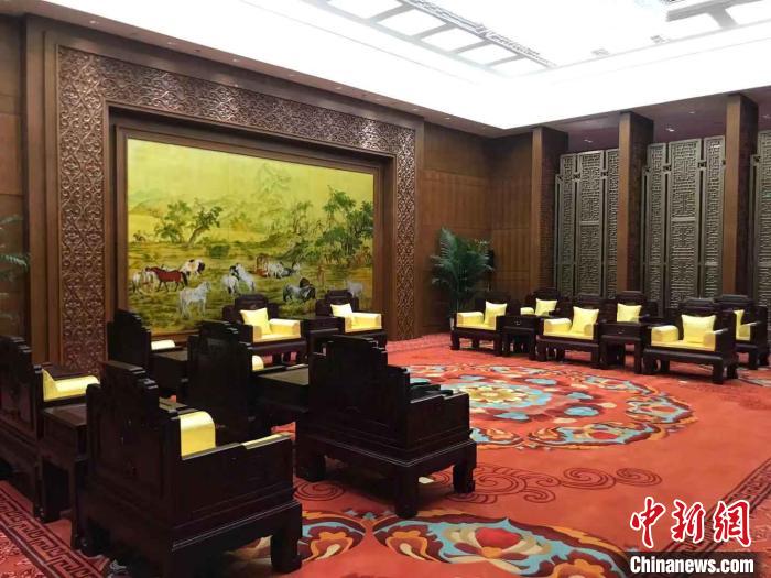 陳玉樹介紹,《松風》的創作靈感源自宮廷舊藏——乾隆時期紫檀嵌玉寶座。作品采用世界名貴木材和純手工雕刻工藝,其椅面寬大,直靠背,搭腦后延似卷書狀,上雕蝙蝠銅錢周邊輔以拐子龍圖樣,寓意“福壽雙全”。扶手兩側均刻以松枝寓長青不老、堅韌忠貞之意。靠背板以高超的“絲翎檀雕”工藝雕以“松鶴延年圖”。后背板更雕以“五福捧壽”圖樣,前后呼應,福壽雙至。座面下打洼束腰,拐子紋飾直牙條,方腿直下,半部略呈鼓腿后順沿而下外翻祥云紋馬蹄足。整套造型體量寬大,紋飾繁復,具有典型的清式家具特色。