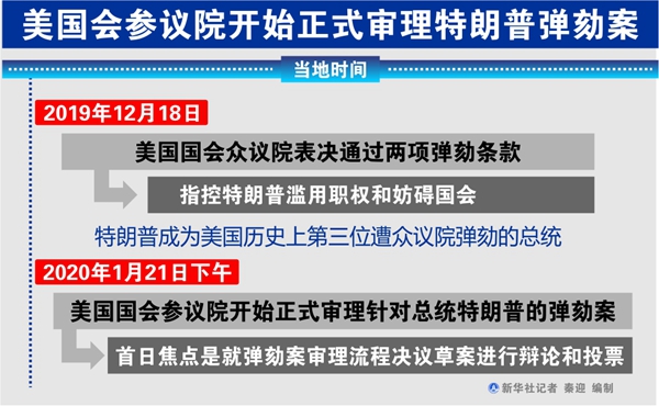 美國國會參議院21日下午開始正式審理針對總統特朗普的彈劾案,首日焦點是就彈劾案審理流程決議草案進行辯論和投票。
