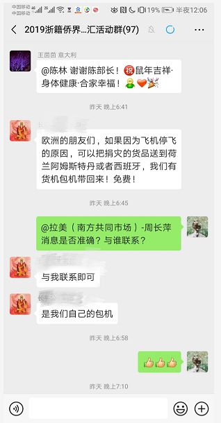 2月1日晚,浙江省僑界名媛匯微信群里的一則信息引起了大家的注意。“歐洲的朋友們,如果因為飛機停飛的原因,可以把捐災的貨品送到荷蘭阿姆斯特丹或者西班牙,我們有貨機包機帶回來!免費!”群里瞬間沸騰,求助信息紛至沓來。省僑聯黨組書記、主席連小敏捕捉到這一信息,隨即高度重視,求證確認后,第一時間研究討論,展開部署。