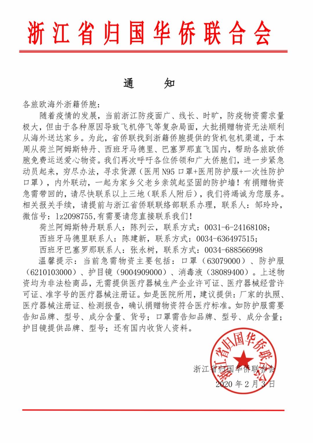 大疫當前爭分奪秒。2月3日,一則浙江省歸國華僑聯合會聯系貨運包機直飛國內尋求抗疫捐贈物資的通知,將眾多歐洲華僑華人凝聚在一起。