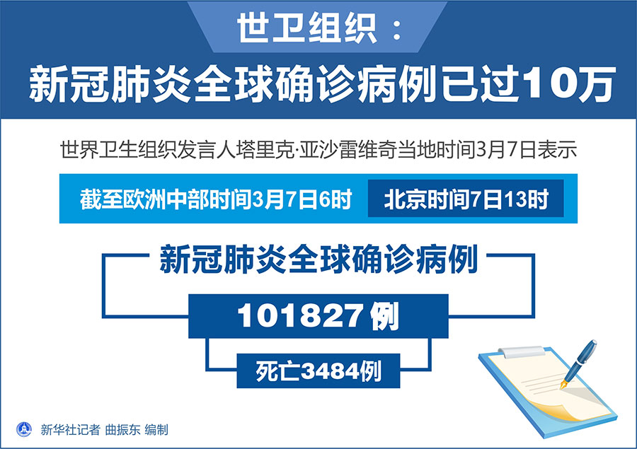 新華社日內瓦3月7日電(記者劉曲 陳俊俠)世界衛生組織發言人塔里克·亞沙雷維奇7日對新華社記者說,新冠肺炎全球確診病例數已突破10萬。