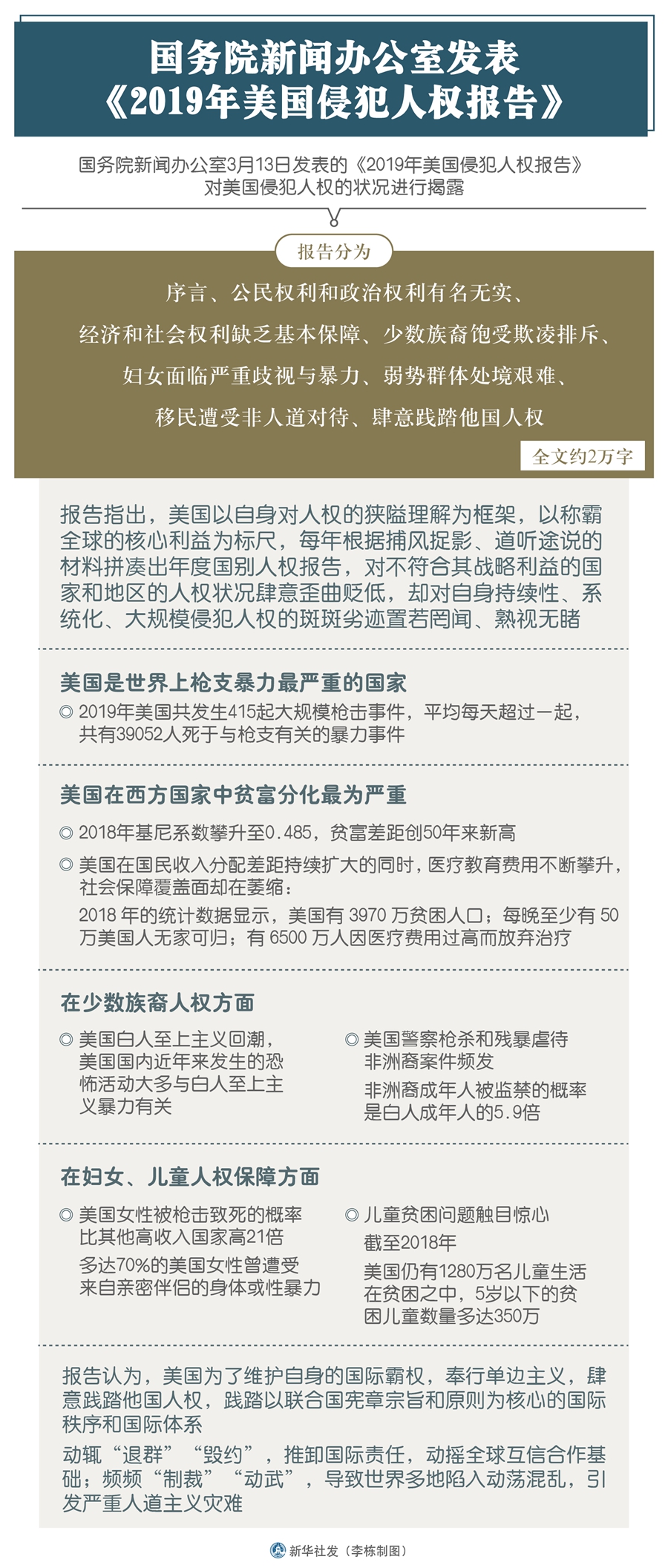 新華社北京3月13日電(記者王子銘、張云龍)國務院新聞辦公室13日發表《2019年美國侵犯人權報告》,對美國侵犯人權的狀況進行揭露。
