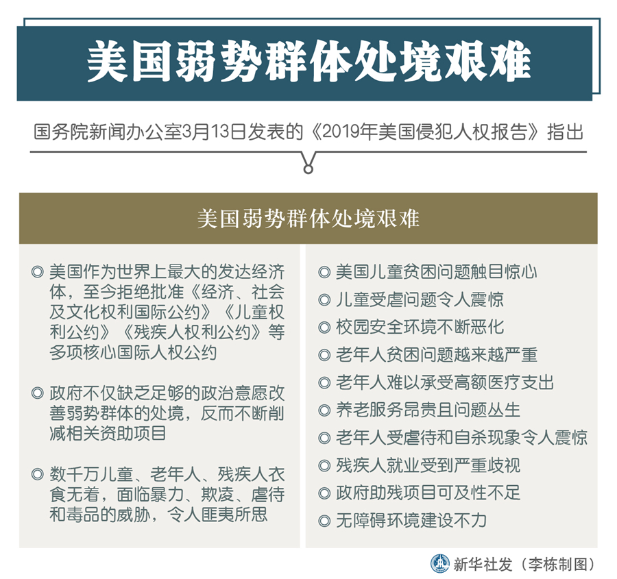 新華社北京3月13日電(記者王鵬、賈釗)國務院新聞辦13日發表的《2019年美國侵犯人權報告》指出,美國弱勢群體處境艱難。