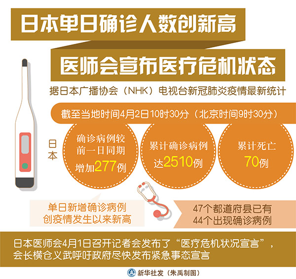 日本醫(yī)師會(huì)1日召開(kāi)記者會(huì)指出日本一些地區(qū)病床不足,并發(fā)布了“醫(yī)療危機(jī)狀況宣言”。醫(yī)師會(huì)會(huì)長(zhǎng)橫倉(cāng)義武呼吁政府盡快發(fā)布緊急事態(tài)宣言。他說(shuō)現(xiàn)在采取的對(duì)策要在兩周后才看到效果,等疫情暴發(fā)后就太晚了。