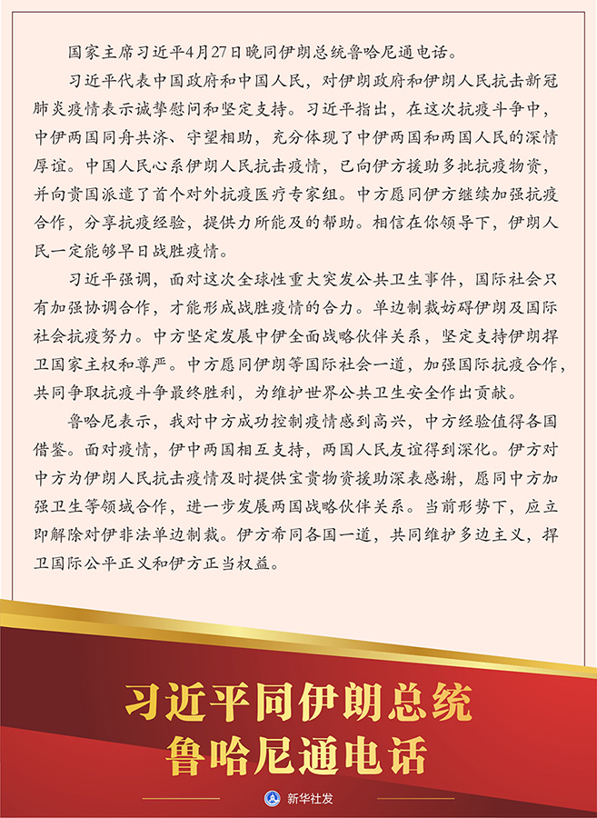 習近平代表中國政府和中國人民,對伊朗政府和伊朗人民抗擊新冠肺炎疫情表示誠摯慰問和堅定支持。習近平指出,在這次抗疫斗爭中,中伊兩國同舟共濟、守望相助,充分體現了中伊兩國和兩國人民的深情厚誼。中國人民心系伊朗人民抗擊疫情,已向伊方援助多批抗疫物資,并向貴國派遣了首個對外抗疫醫療專家組。中方愿同伊方繼續加強抗疫合作,分享抗疫經驗,提供力所能及的幫助。相信在你領導下,伊朗人民一定能夠早日戰勝疫情。