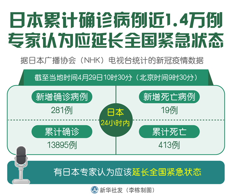 新華社東京4月29日電(記者華義)據(jù)日本廣播協(xié)會(NHK)電視臺統(tǒng)計的新冠疫情數(shù)據(jù),截至29日10時30分(北京時間9時30分),日本24小時內(nèi)新增確診病例281例,累計確診13895例;新增死亡病例19例,累計死亡413例。有日本專家認(rèn)為應(yīng)該延長全國緊急狀態(tài)。