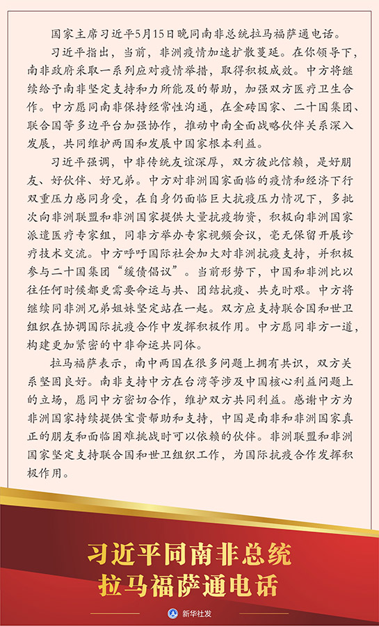 習(xí)近平指出,當(dāng)前,非洲疫情加速擴散蔓延。在你領(lǐng)導(dǎo)下,南非政府采取一系列應(yīng)對疫情舉措,取得積極成效。中方將繼續(xù)給予南非堅定支持和力所能及的幫助,加強雙方醫(yī)療衛(wèi)生合作。中方愿同南非保持經(jīng)常性溝通,在金磚國家、二十國集團、聯(lián)合國等多邊平臺加強協(xié)作,推動中南全面戰(zhàn)略伙伴關(guān)系深入發(fā)展,共同維護兩國和發(fā)展中國家根本利益。
