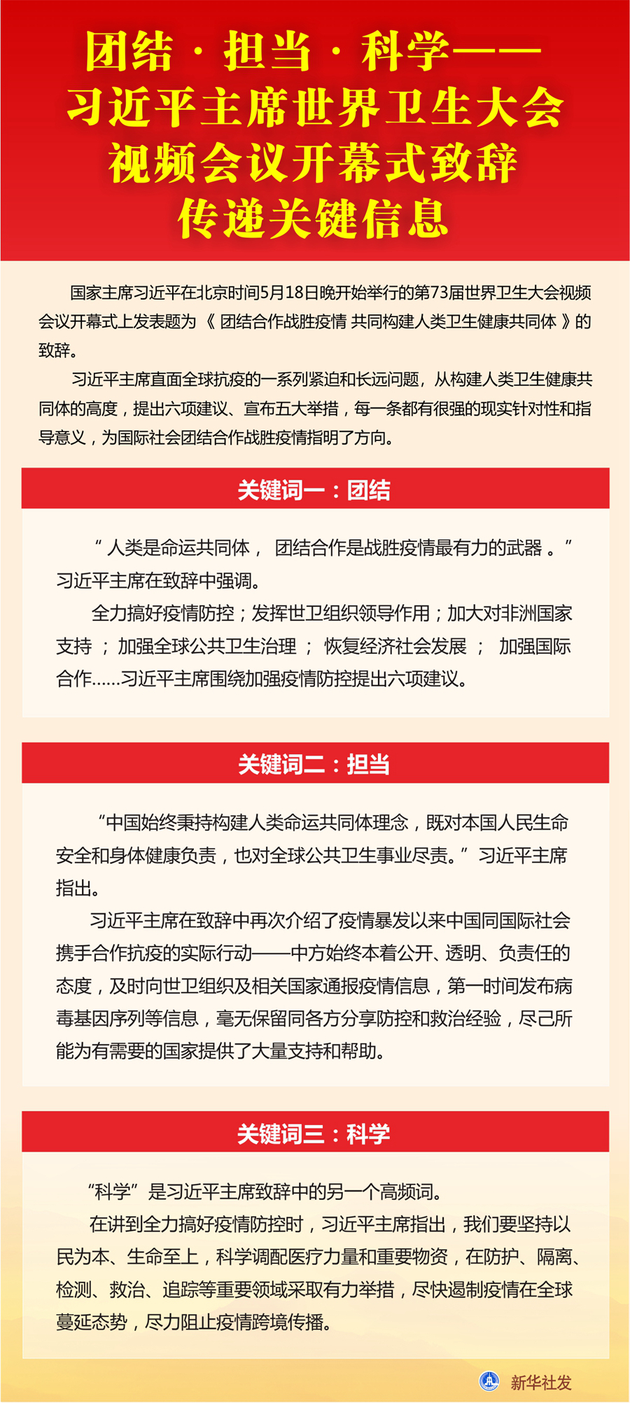 新華社北京5月18日電? 綜合新華社駐外記者報道:國家主席習近平18日晚在第73屆世界衛生大會視頻會議開幕式上發表題為《團結合作戰勝疫情 共同構建人類衛生健康共同體》的致辭。世界衛生組織官員及多國人士認為,習近平主席在致辭中提出的加強疫情防控六項建議、中國為推進全球抗疫合作的五大舉措秉持構建人類命運共同體理念,體現了中國負責任大國擔當,對推動抗擊疫情國際合作具有重要意義。