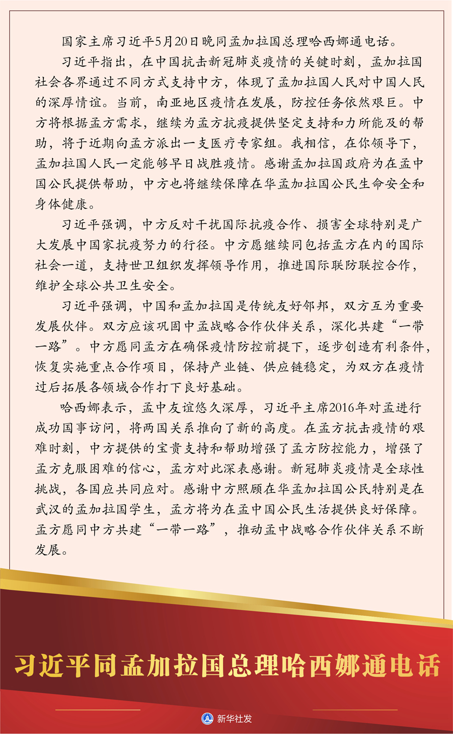 習近平指出,在中國抗擊新冠肺炎疫情的關鍵時刻,孟加拉國社會各界通過不同方式支持中方,體現了孟加拉國人民對中國人民的深厚情誼。當前,南亞地區疫情在發展,防控任務依然艱巨。中方將根據孟方需求,繼續為孟方抗疫提供堅定支持和力所能及的幫助,將于近期向孟方派出一支醫療專家組。我相信,在你領導下,孟加拉國人民一定能夠早日戰勝疫情。感謝孟加拉國政府為在孟中國公民提供幫助,中方也將繼續保障在華孟加拉國公民生命安全和身體健康。