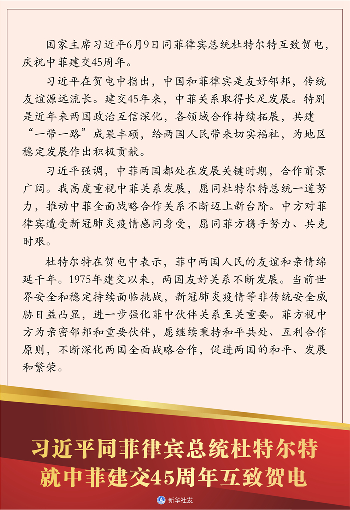 新華社北京6月9日電 國家主席習近平6月9日同菲律賓總統杜特爾特互致賀電,慶祝中菲建交45周年。