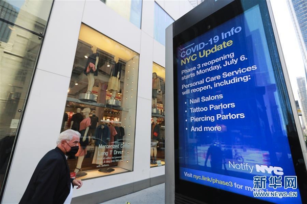 7月4日,一名行人從美國(guó)紐約第五大道顯示新冠疫情最新情況的信息屏旁經(jīng)過(guò)。新華社記者 王迎 攝