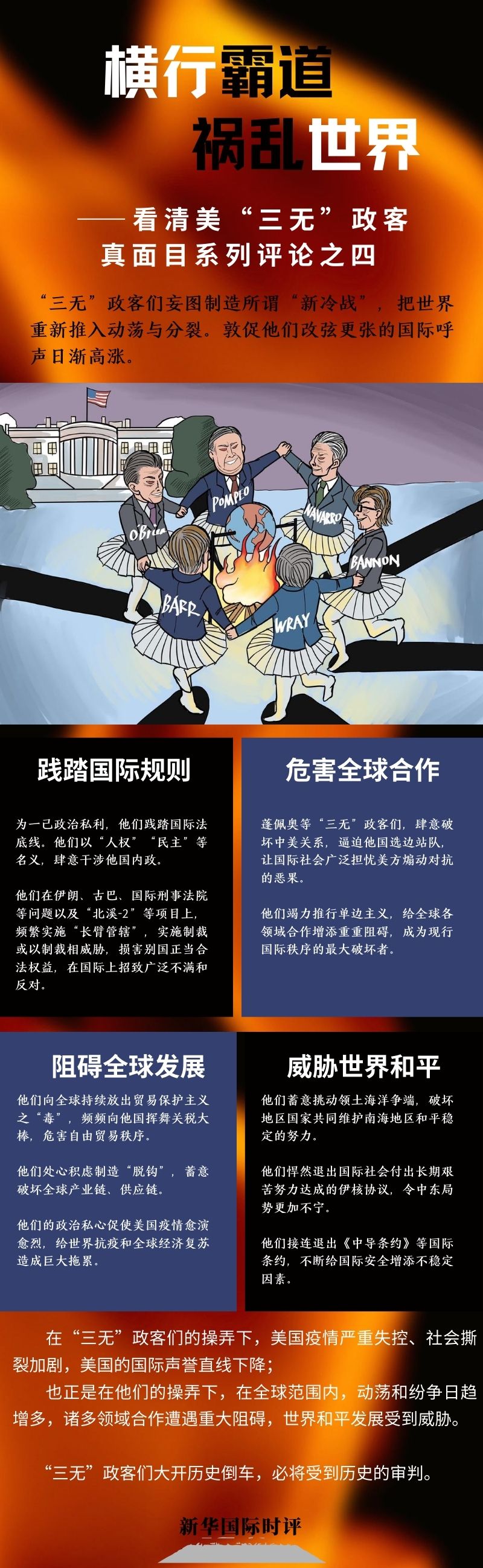 “三無”政客們的亂言與惡行,正在美國和國際上造成種種惡果。正是在他們的操弄下,美國疫情嚴重失控、社會撕裂加劇,美國的國際聲譽直線下降;也正是在他們的操弄下,在全球范圍內,動蕩和紛爭日趨增多,諸多領域合作遭遇重大阻礙,世界和平發展受到威脅。“三無”政客們大開歷史倒車,必將受到歷史的審判。