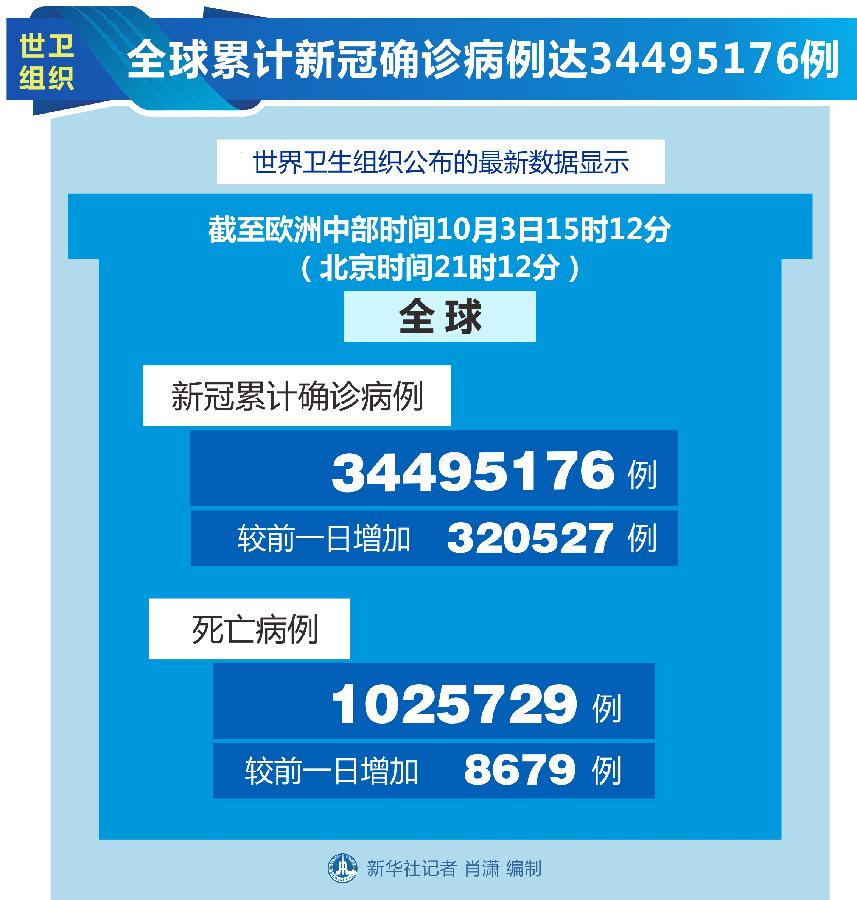 世衛組織網站最新數據顯示,截至歐洲中部時間3日15時12分(北京時間21時12分),全球確診病例較前一日增加320527例,達到34495176例;死亡病例增加8679例,達到1025729例。