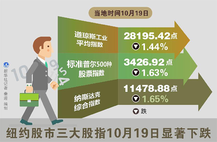新華社快訊:紐約股市三大股指19日下跌,其中,道指跌1.44%,標(biāo)普指數(shù)跌1.63%,納斯達克指數(shù)跌1.65%。