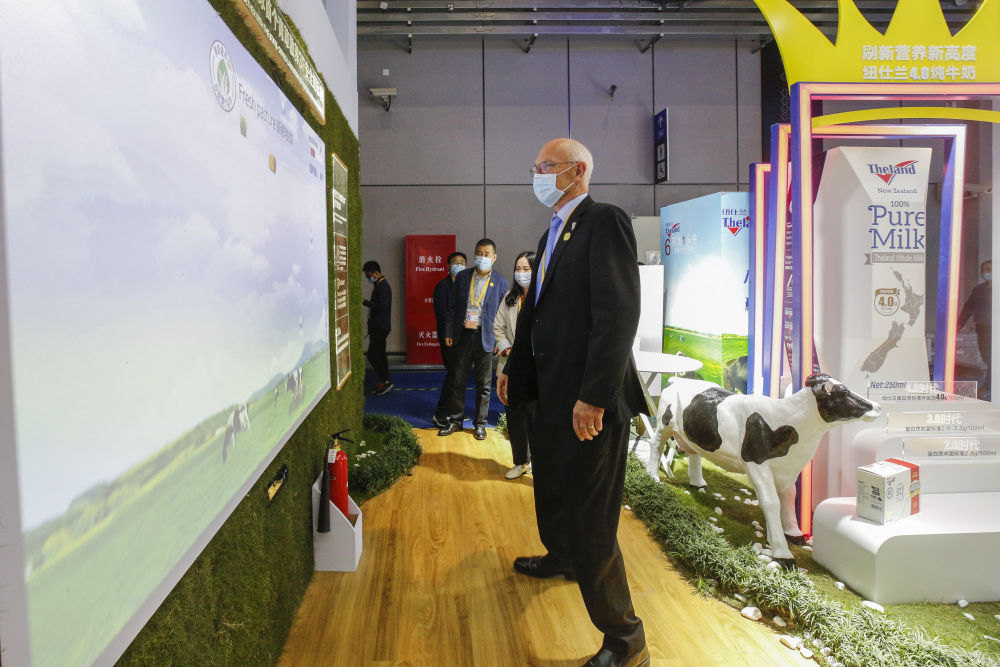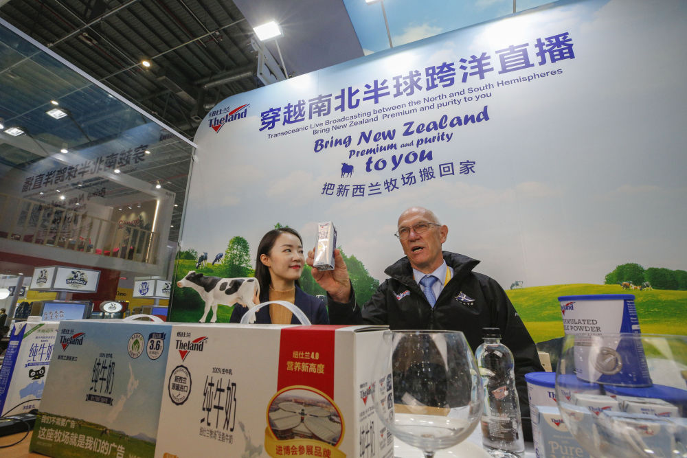 11月5日,羅伊(左一)在進博會上的紐仕蘭乳業展臺參加簽約儀式。