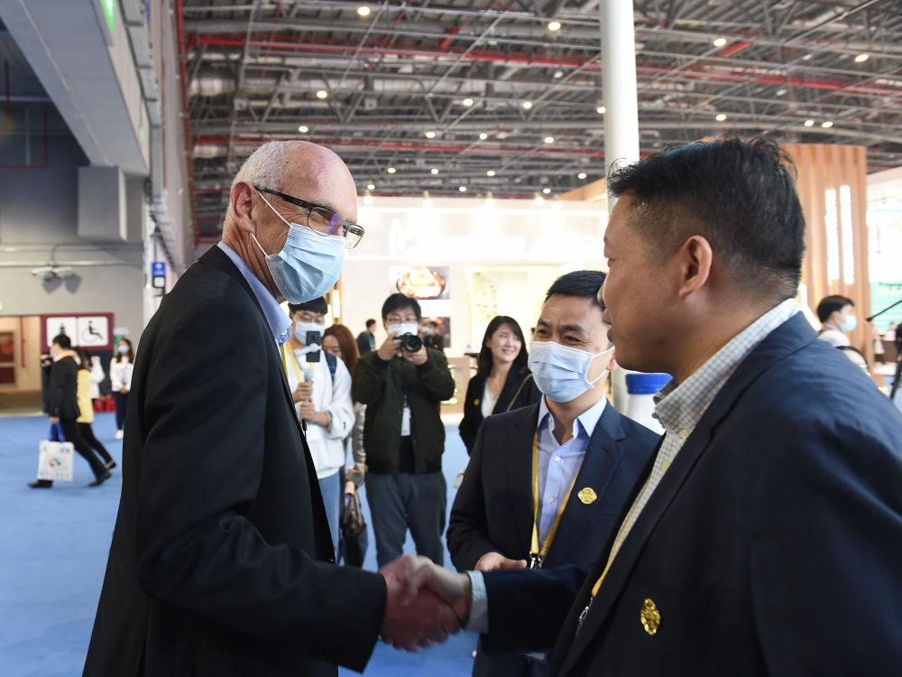 11月5日,羅伊(左)在第三屆進博會現場同合作伙伴交談。