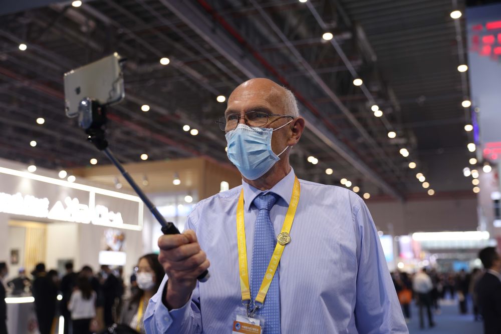 11月7日,羅伊在進博會場館內為合作伙伴介紹產品。