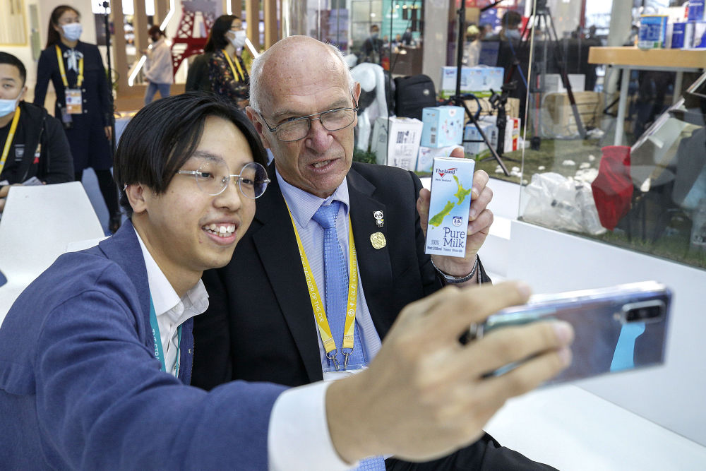 11月7日,羅伊(右)在第三屆進博會紐仕蘭乳業展臺和粉絲合影。