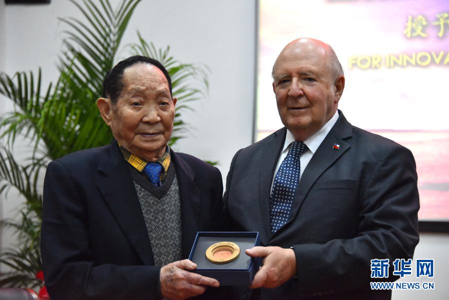 11月16日,智利駐華大使路易斯·施密特·蒙特斯向袁隆平頒發(fā)“中智建交50周年紀(jì)念獎?wù)隆薄P氯A社記者 周勉 攝