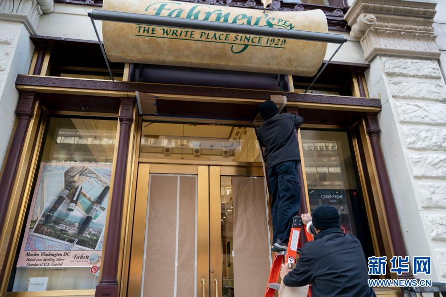 11月19日,在美國(guó)華盛頓,工作人員在裝修一家文具店的門臉。新華社記者 劉杰 攝
