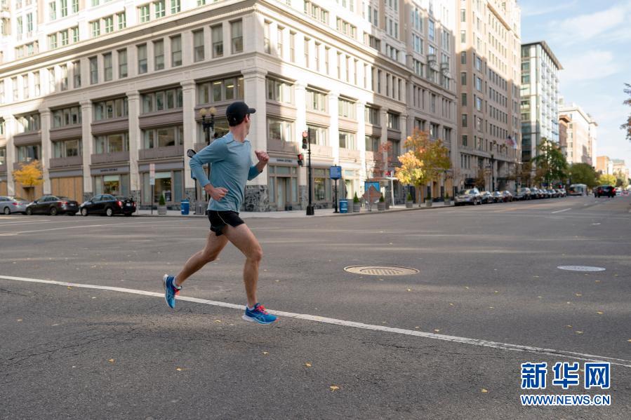 11月19日,在美國(guó)華盛頓,一名男子跑步經(jīng)過(guò)車輛稀少的路口。新華社記者 劉杰 攝