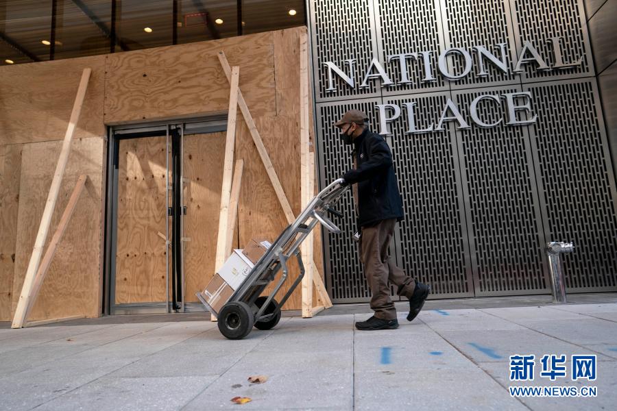 11月19日,美國(guó)華盛頓的一名快遞員經(jīng)過(guò)一處用木板加固門窗的辦公樓。新華社記者 劉杰 攝