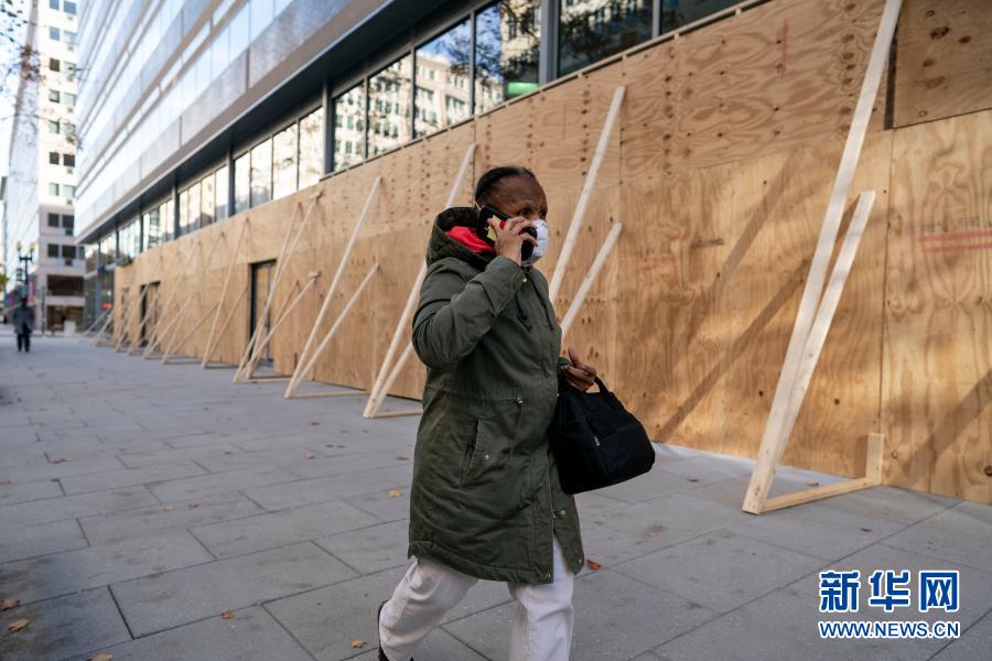 11月19日,在美國(guó)華盛頓,一名打電話的行人經(jīng)過(guò)用木板加固門窗的辦公樓。新華社記者 劉杰 攝