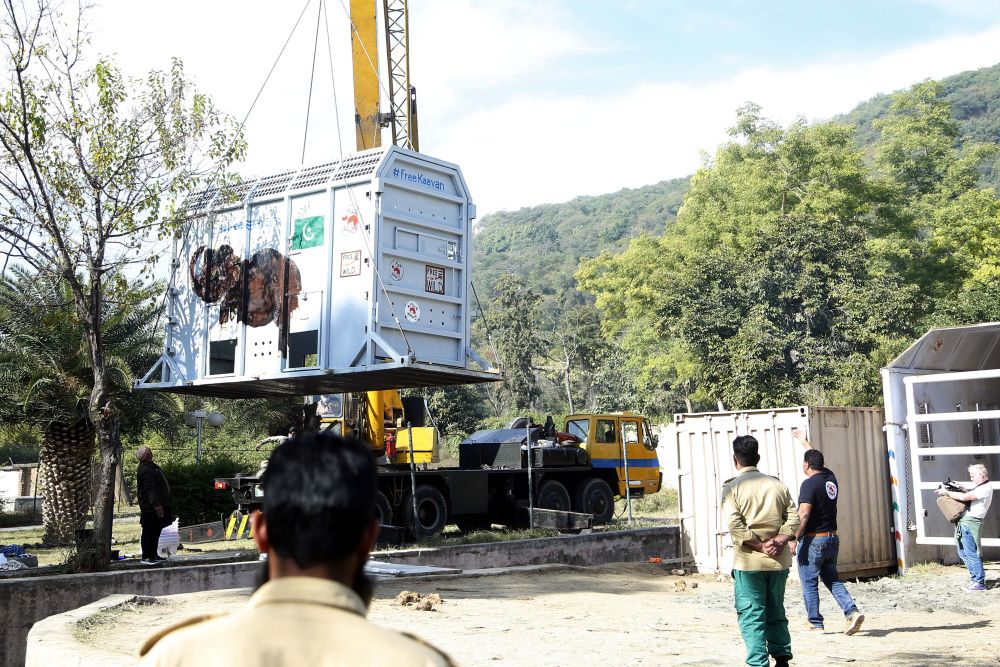 ↑11月29日,在巴基斯坦伊斯蘭堡,工作人員為運(yùn)輸大象做準(zhǔn)備
