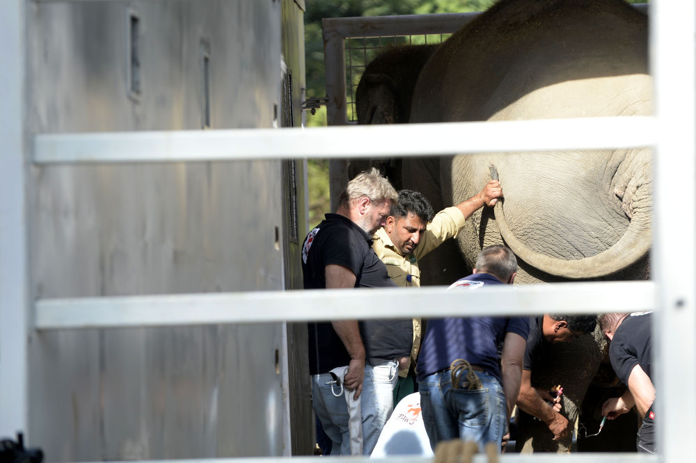 ↑工作人員搬運(yùn)裝有大象的運(yùn)輸箱