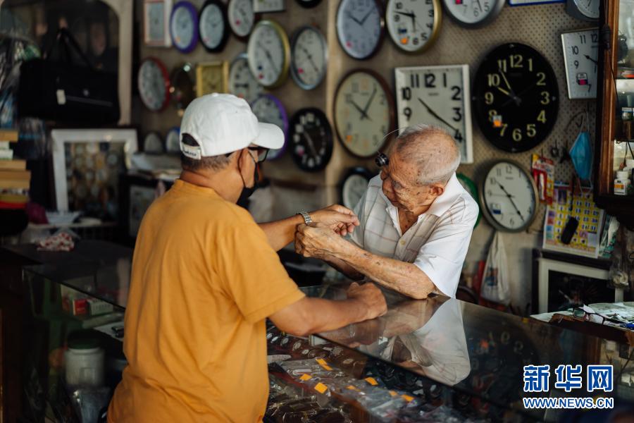 12月5日,在馬來(lái)西亞雪蘭莪州巴生的郁昌表行,韋華為顧客佩戴修好的手表。新華社記者 朱煒 攝