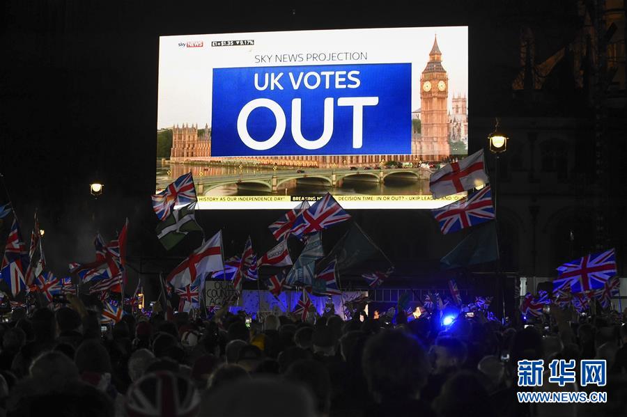 2020年1月31日晚,在英國倫敦,支持“脫歐”的人們在議會廣場集會,慶祝“脫歐”。大屏幕上顯示“英國選擇脫歐”。 新華社發(史蒂芬·程攝)