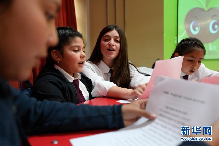2019年10月11日,洛蕾托·約斯(中)在智利南部紐夫萊大區(qū)的圣尼古拉斯中學的課堂上學習漢語。新華社發(fā)(豪爾赫·比列加斯攝)