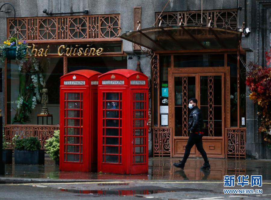12月21日,一名戴口罩的男子經(jīng)過英國(guó)倫敦特拉法加廣場(chǎng)旁一家關(guān)閉的餐廳。新華社記者 韓巖 攝