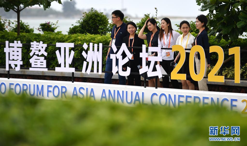 4月18日,參會(huì)人員在博鰲亞洲論壇2021年年會(huì)標(biāo)志前合影留念。