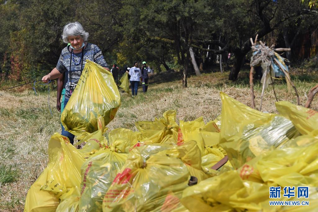 4月22日,南非比勒陀利亞的志愿者將收集好的垃圾放到指定區域。