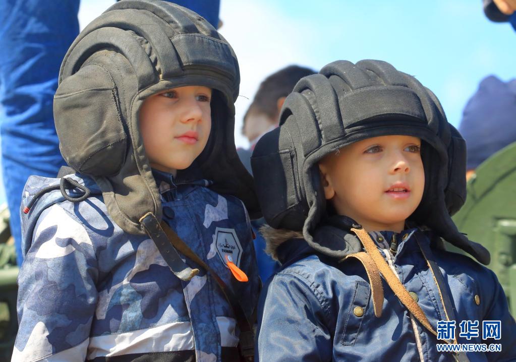 5月9日,在白俄羅斯首都明斯克,參加勝利日節慶活動的兒童頭戴二戰時期軍用頭盔。