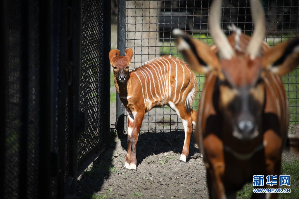 5月10日,兩周大的幼年山地紫羚與母親一起在波蘭首都華沙的華沙動(dòng)物園的籠舍中散步。