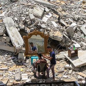 5月26日,在加沙地帶北部的城鎮貝特拉希亞,23歲的巴勒斯坦理發師阿卜杜拉·扎瓦拉在他被以色列炸毀的房屋前為顧客免費服務。 新華社發(里澤克·阿卜杜勒·賈瓦德攝)