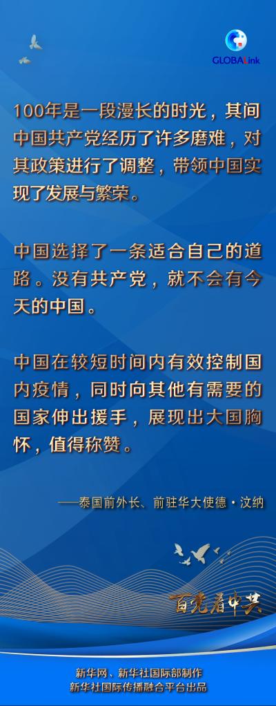 新華社曼谷5月29日電 “100年是一段漫長的時光,其間中國共產黨經歷了許多磨難,對其政策進行了調整,帶領中國實現了發展與繁榮。”泰國前外長、前駐華大使德·汶納日前在曼谷接受新華社專訪時說。