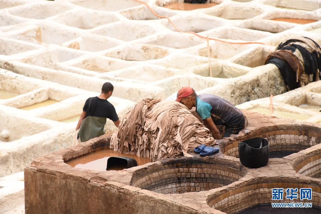 5月30日,工人正在摩洛哥非斯古城內的皮革染坊中勞作。