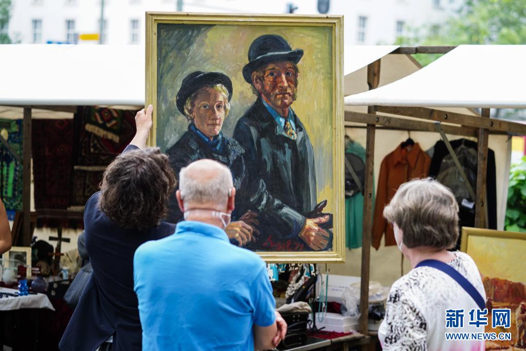 6月6日,人們在德國首都柏林的一處“跳蚤市場”內選購畫作。