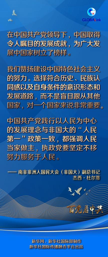 新華社約翰內斯堡6月10日電 在中國共產黨領導下,中國取得令人矚目的發展成就,為廣大發展中國家樹立了榜樣,南非非洲人國民大會(非國大)副總書記杰西·杜爾蒂日前在接受新華社記者采訪時如是說。