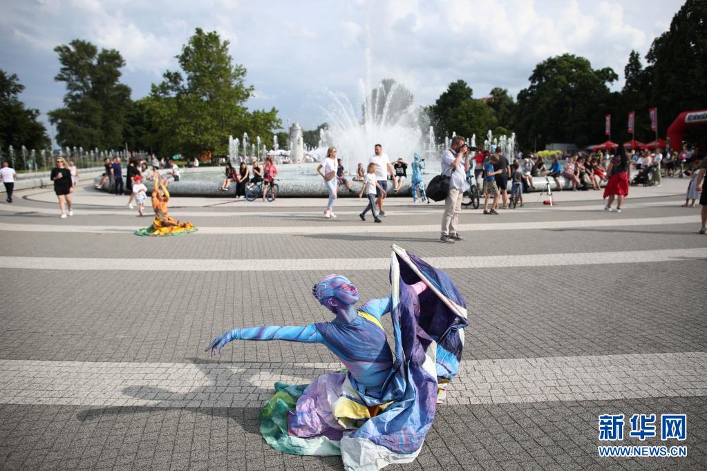 6月26日,舞蹈演員在波蘭首都華沙街頭進行夏日文化娛樂活動的表演。
