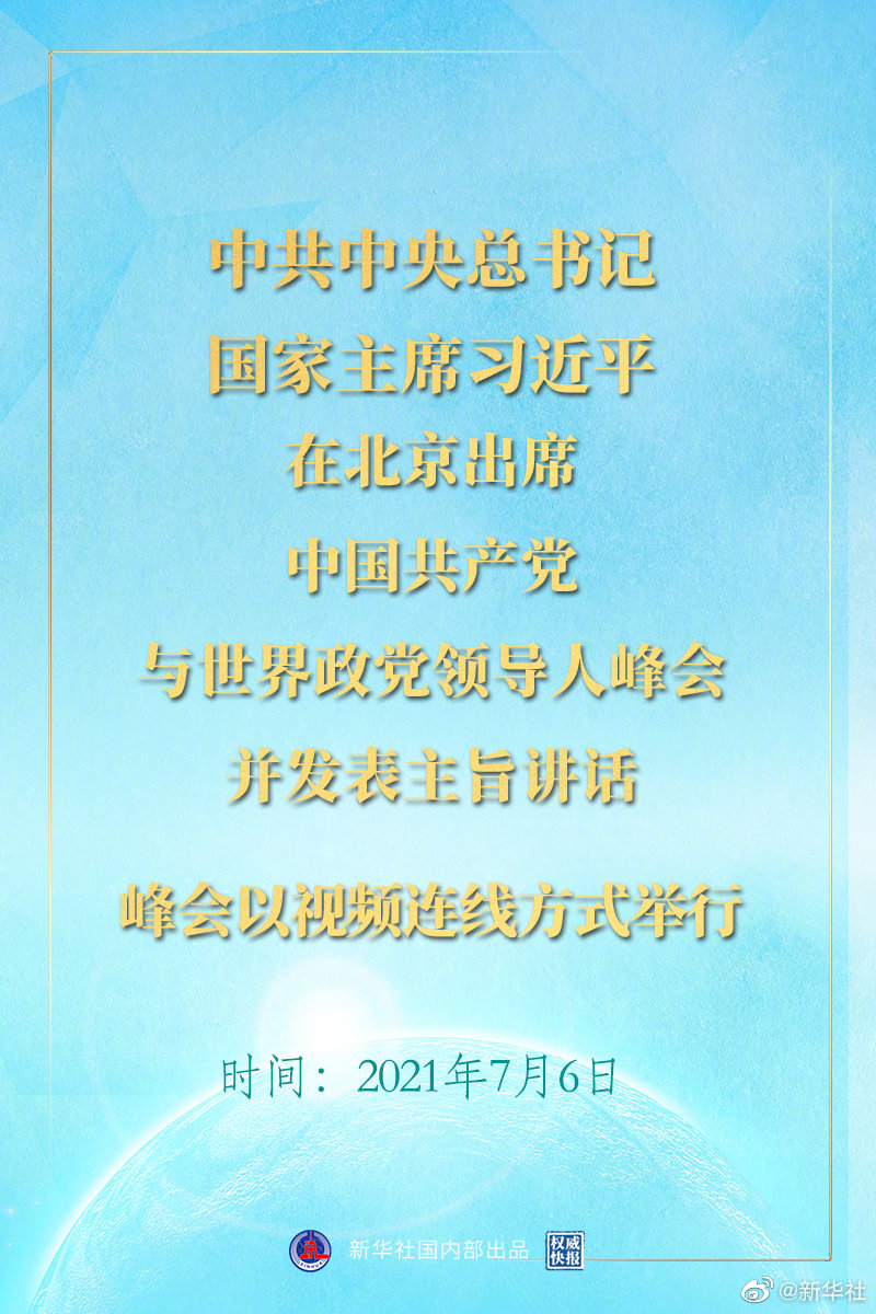 7月6日晚,中共中央總書記、國家主席習近平在北京出席中國共產黨與世界政黨領導人峰會并發表主旨講話。峰會以視頻連線方式舉行。