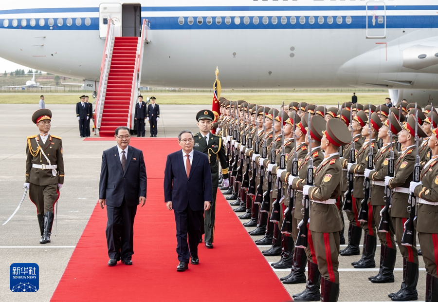 10月9日上午,应朝鲜劳动党中央委员会和朝鲜民主主义人民共和国政府邀请,中共中央政治局常委、国务院总理李强率中国党政代表团乘包机离开北京,赴平壤出席朝鲜劳动党建党80周年庆祝活动并对朝鲜进行正式友好访问。当地时间10月9日中午,李强乘包机抵达平壤顺安国际机场。朝鲜劳动党中央政治局常委、内阁总理朴泰成率党和政府高级官员到机场迎接,并为李强举行欢迎仪式。这是李强在朴泰成陪同下检阅仪仗队。新华社记者 翟健岚 摄